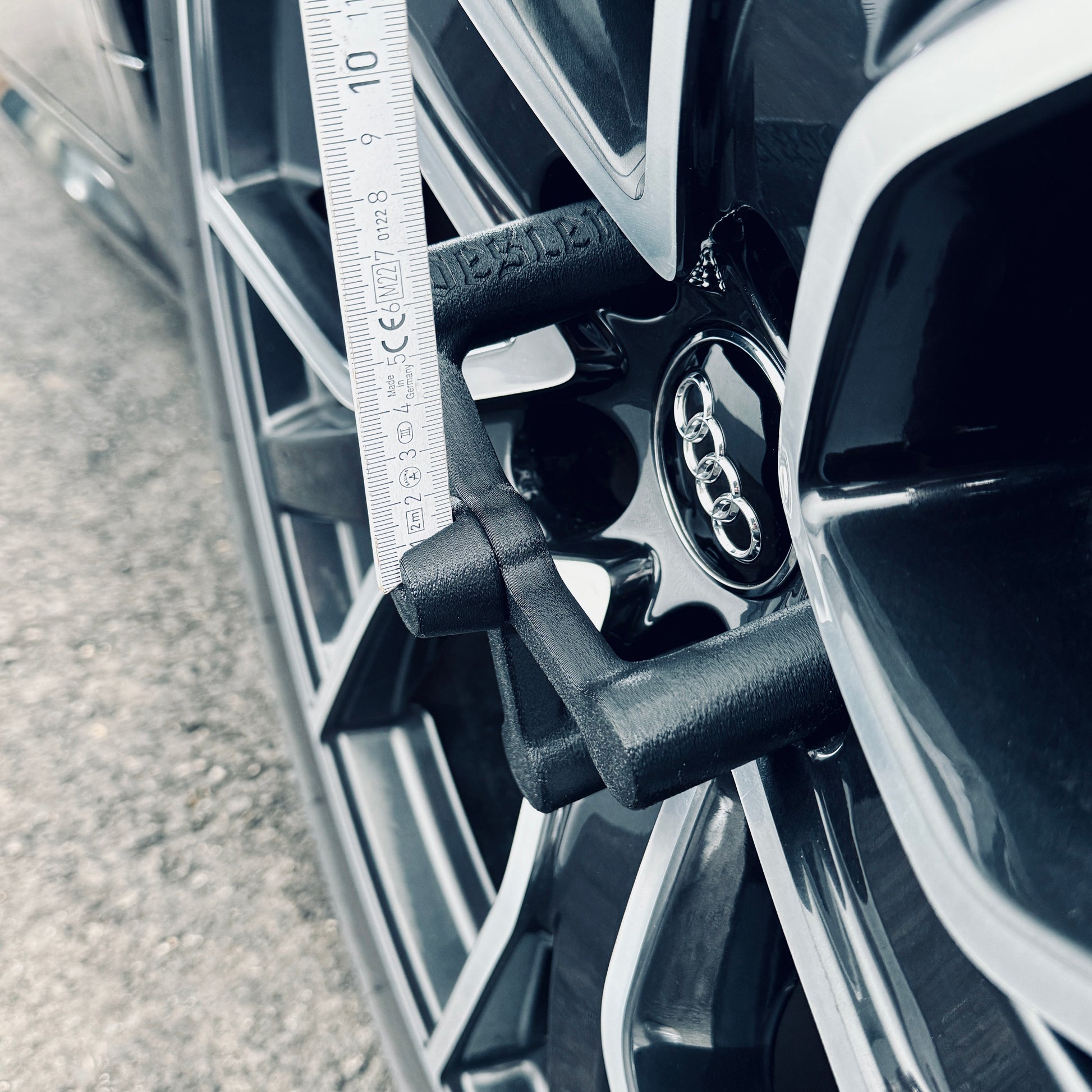 Nezbytný měřicí nástroj pro VCDS snížení podvozku. Jednoduše nasaď na šrouby kol, přilož metr na kloub – a hned změříš přesnou vzdálenost od středu kola ke kraji blatníku.